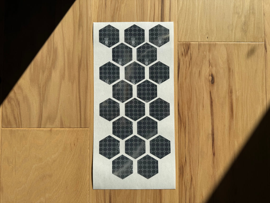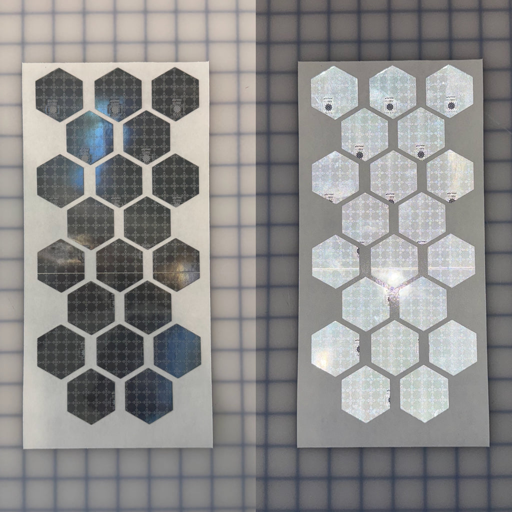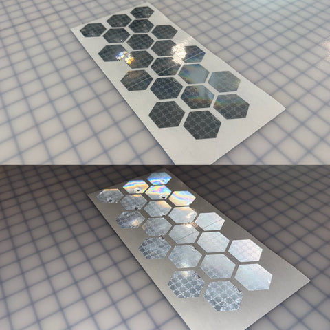Sold by the sheet. Each sheet has 20 Hexagons. 1.75" Inch in size. Silver/Gray in Color. Peel and Stick application. Prismatic Oralite M82 1403 SOLAS.