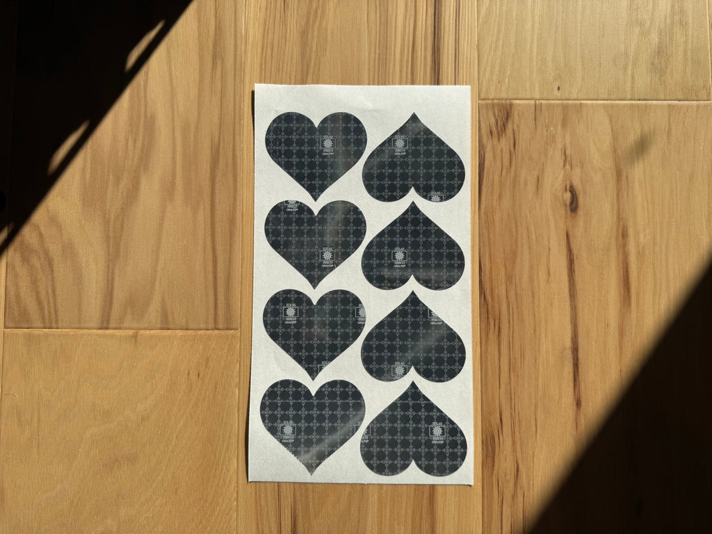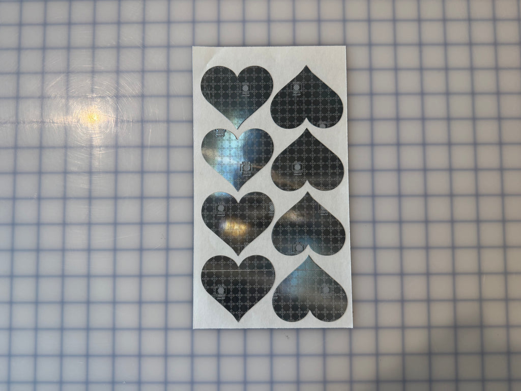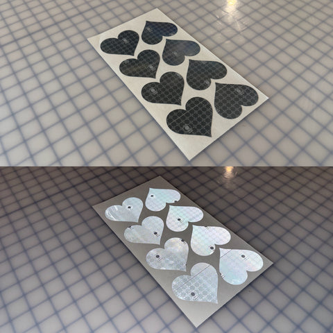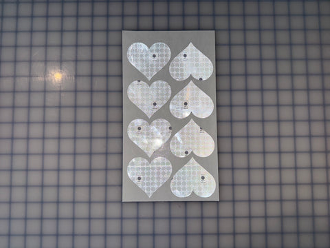 Sold by the sheet. Each sheet has 8 Hearts. 2.5" x 2.85" Inch in size. Silver/Gray in Color. Peel and Stick application. Prismatic Oralite M82 1403 SOLAS.