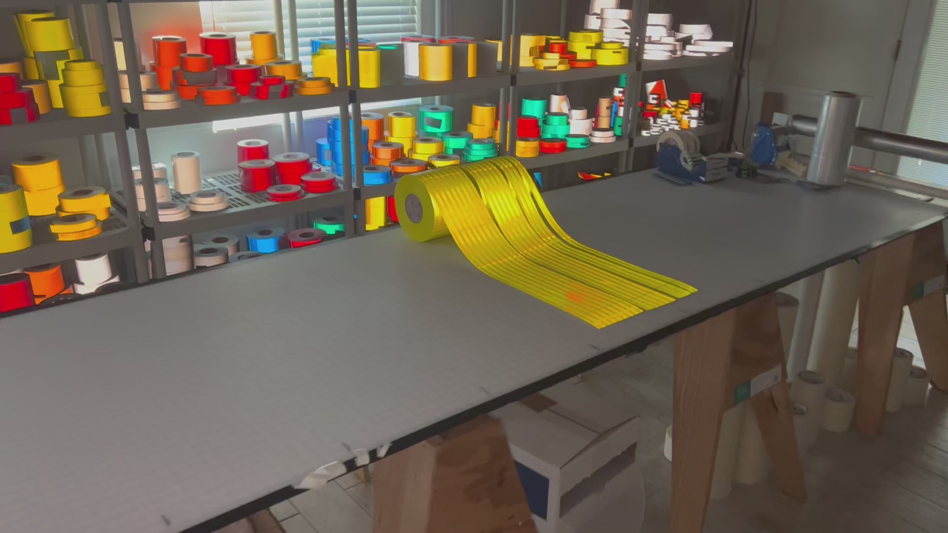 We carry lime, white, red, yellow, orange, blue, and green. This film has a tough glossy acrylic surface. Used to mark loading dock areas, bollards, gates, barricades, non-DOT regulated trailers, and vehicles, etc...