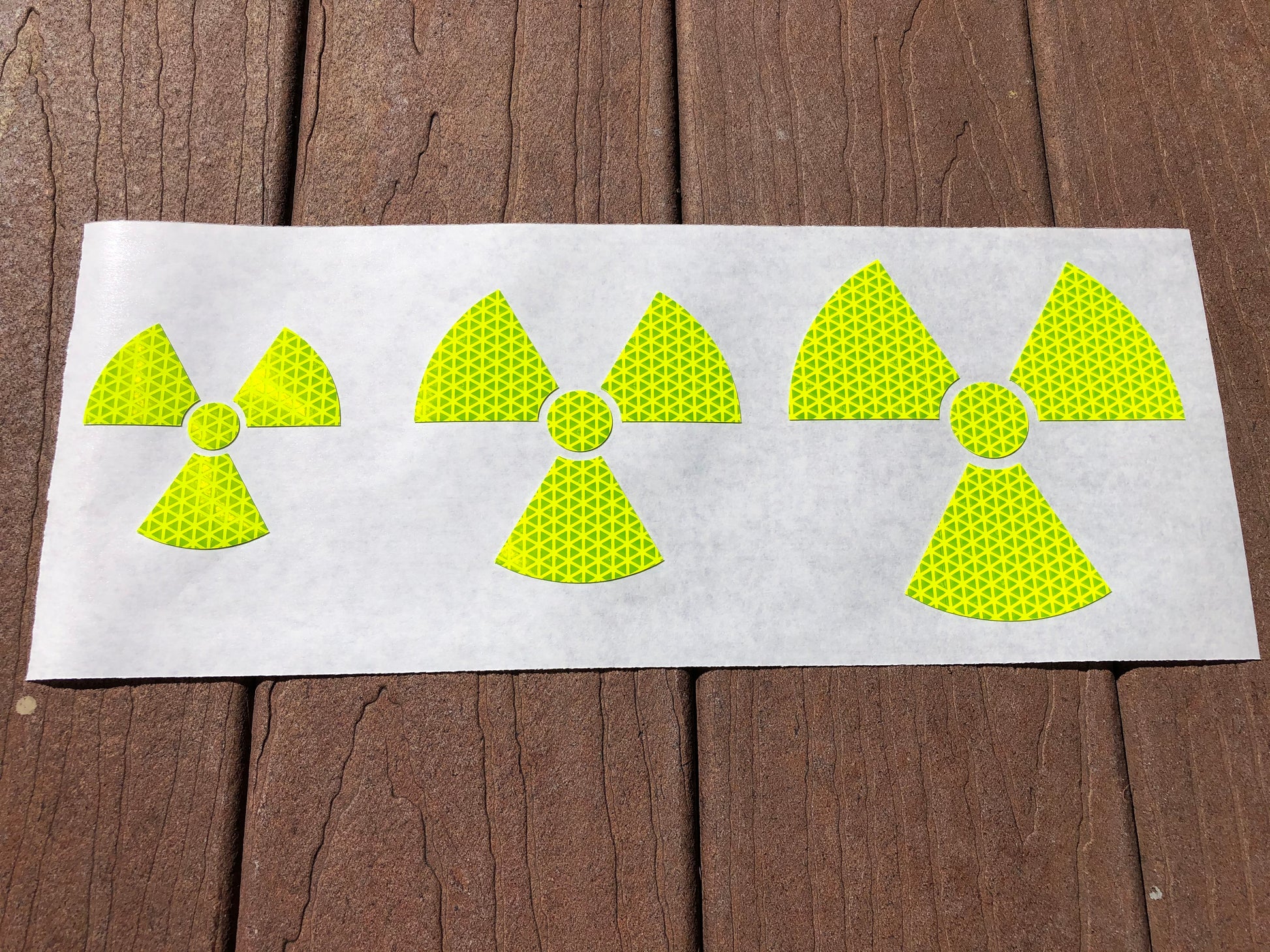 This product is an Oralite V98 Reflective Radiation Decal. They are extremely bright and high quality because we use Oralite's V98 material since it is the best on the market. They can be seen for up to 1000 feet away with a strong direct light source. Oralite is the company that invented retroreflectivity and have been industry trendsetters ever since. Rest assured when we tell you that there is no better or brighter product on the market than ours.